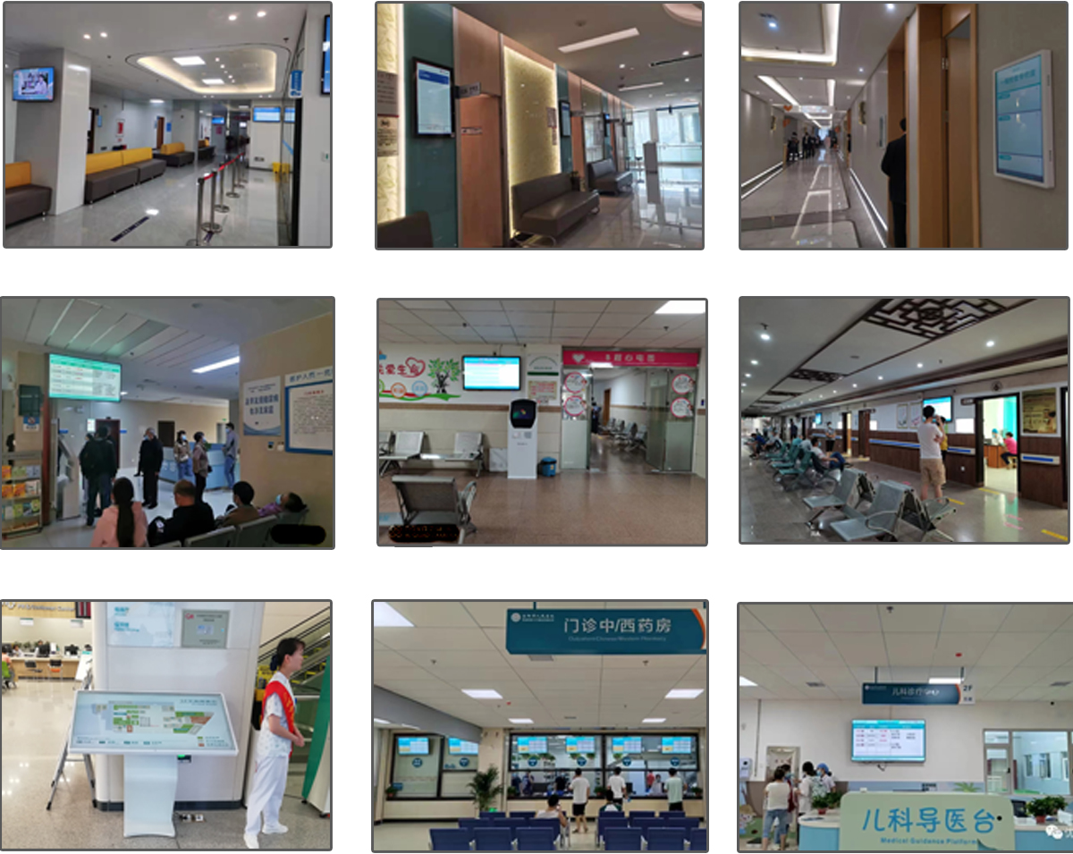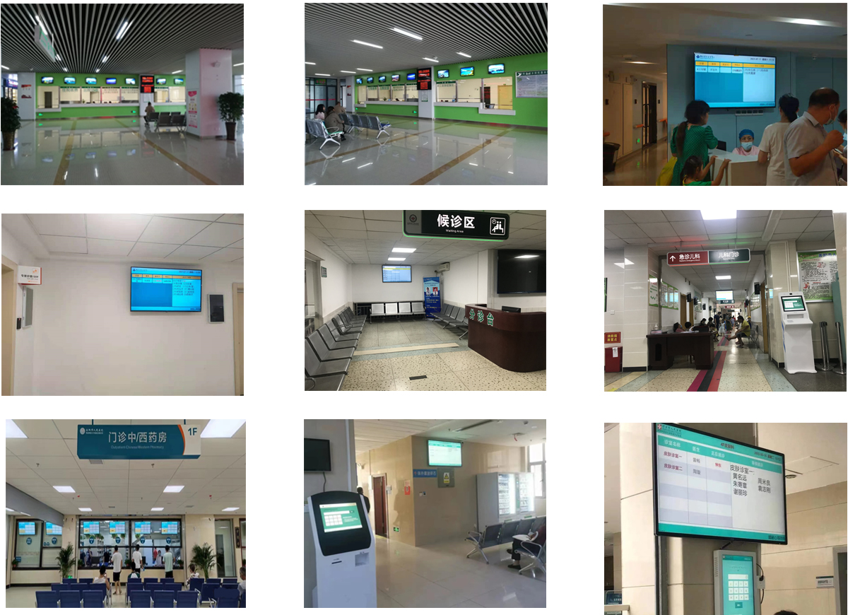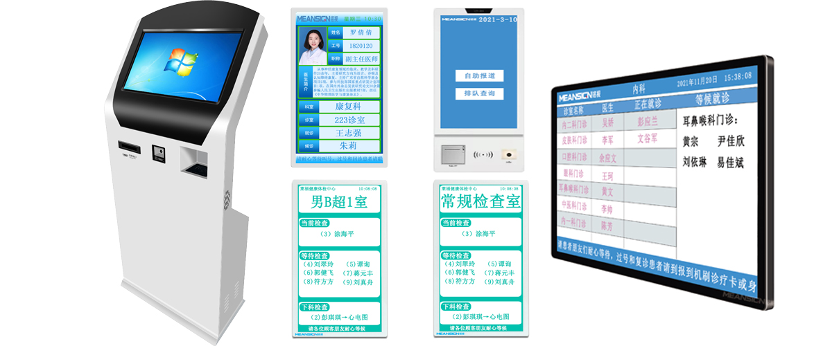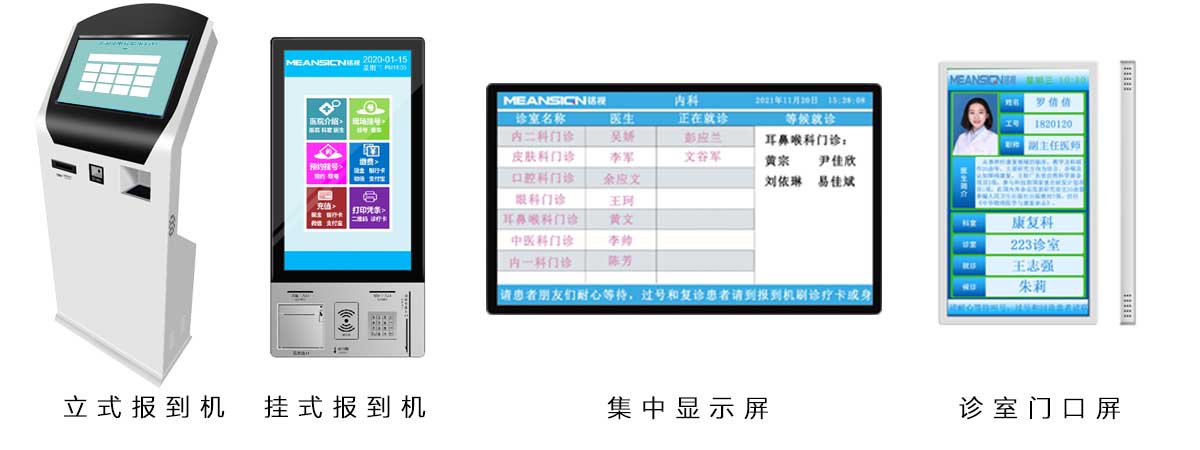 醫(yī)療叫號系統(tǒng)所使用的硬件設備包括:自助報到機、診室門口屏、集中顯示屏、醫(yī)生排班顯示屏、自助取單機等,其中診室門口屏有15.6、18.5、21.5、23、27等尺寸,集中顯示屏有32、43、49、55、65、75、85、100等尺寸,報到機支持壁掛和立式兩種,可增加二維碼掃描模塊、小票打印機模塊、刷卡模塊、身份證識別模塊、攝像頭模塊等外設。